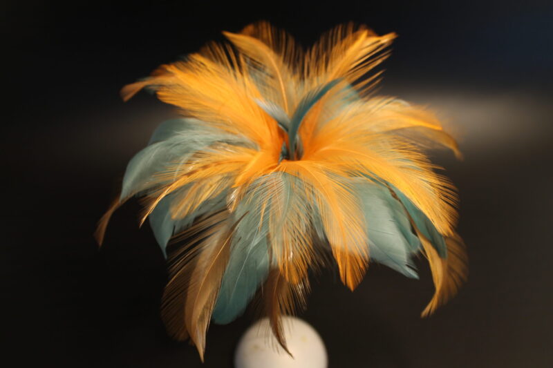Sylvie Châtillon transforme des plumes naturelles, issues exclusivement de la mue des oiseaux (coq, faisan, pintade, oie, autruche…), et des fibres végétales en sculptures poétiques.