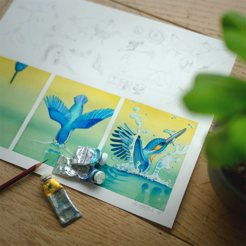 Dominique MERTENS, illustrateur jeunesse belge, vous propose de réaliser votre propre triptyque « martin-pêcheur ».